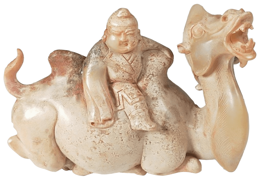 圓雕一戴冠胡人一臉福相 身穿長袖錦鍛 意氣煥發騎在 一雙峯駱駝上。